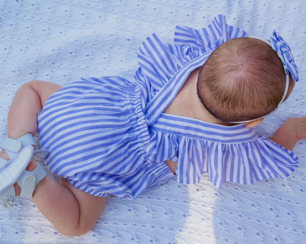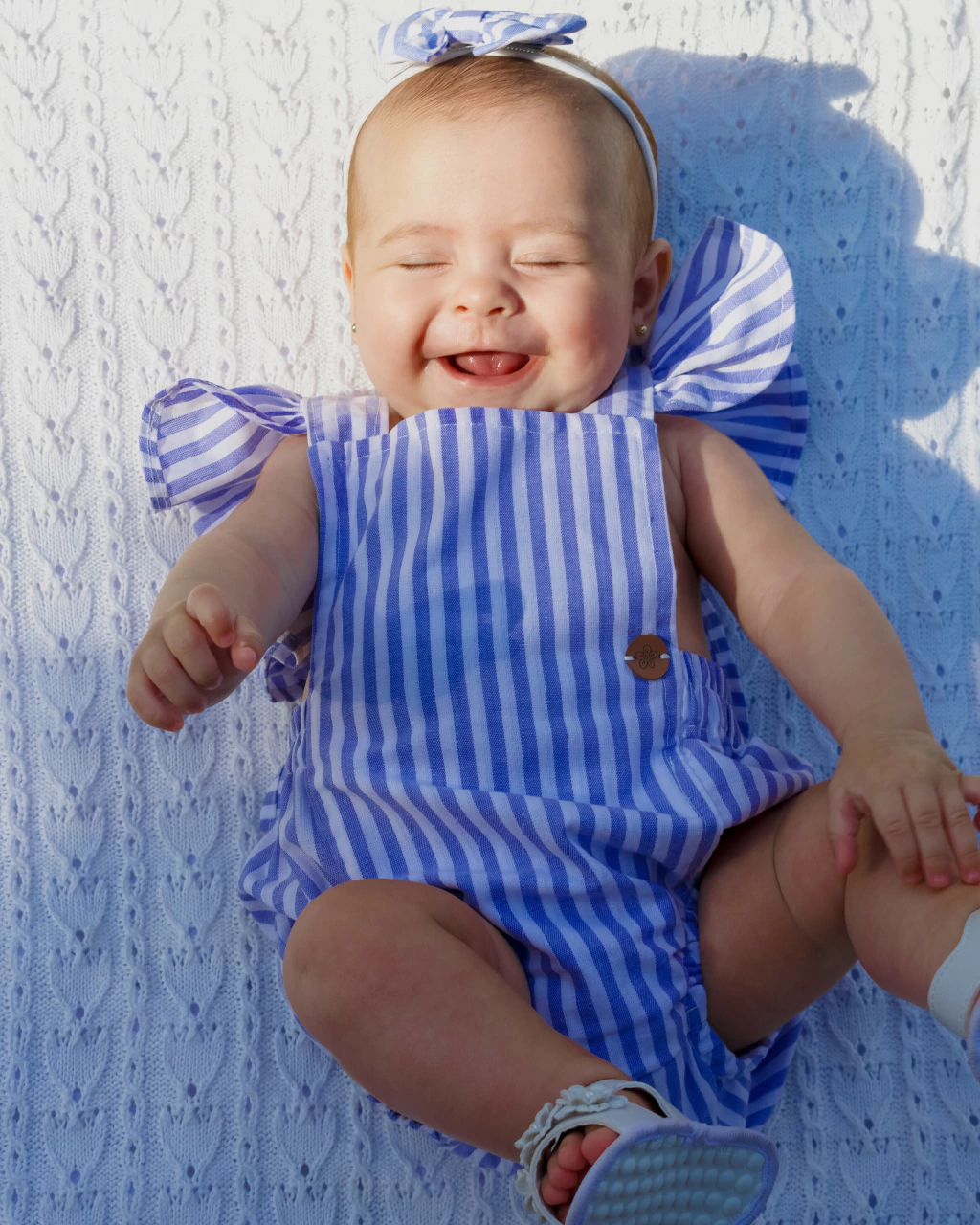 Perfeito para meninas bebês, o Romper Babado Capri une conforto e estilo com seu tecido 100% algodão Supertone. Com listras delicadas em azul e branco, proporciona frescor e liberdade para os momentos do dia a dia.