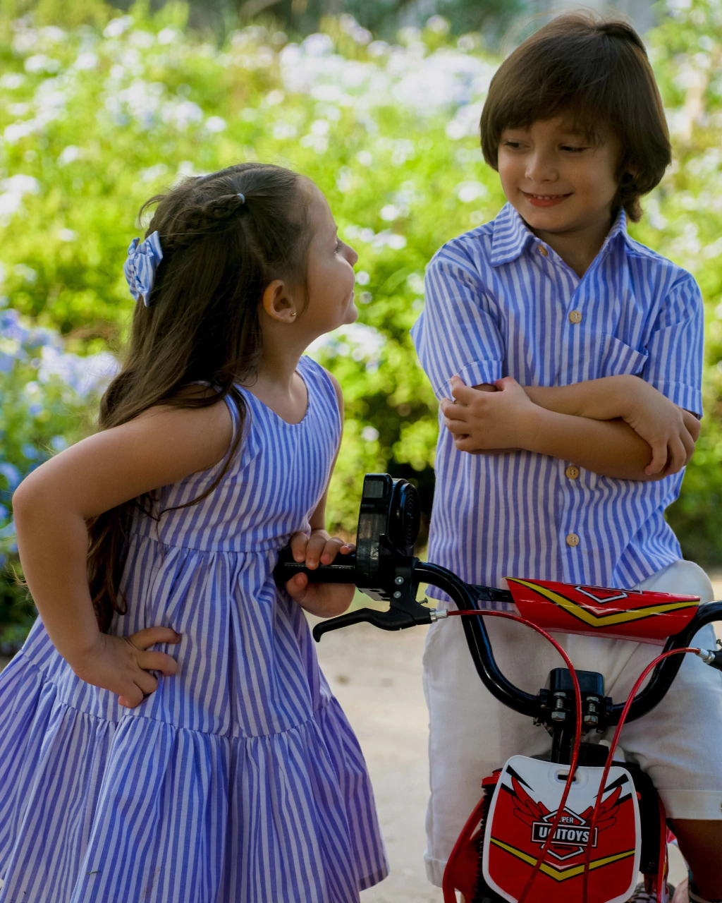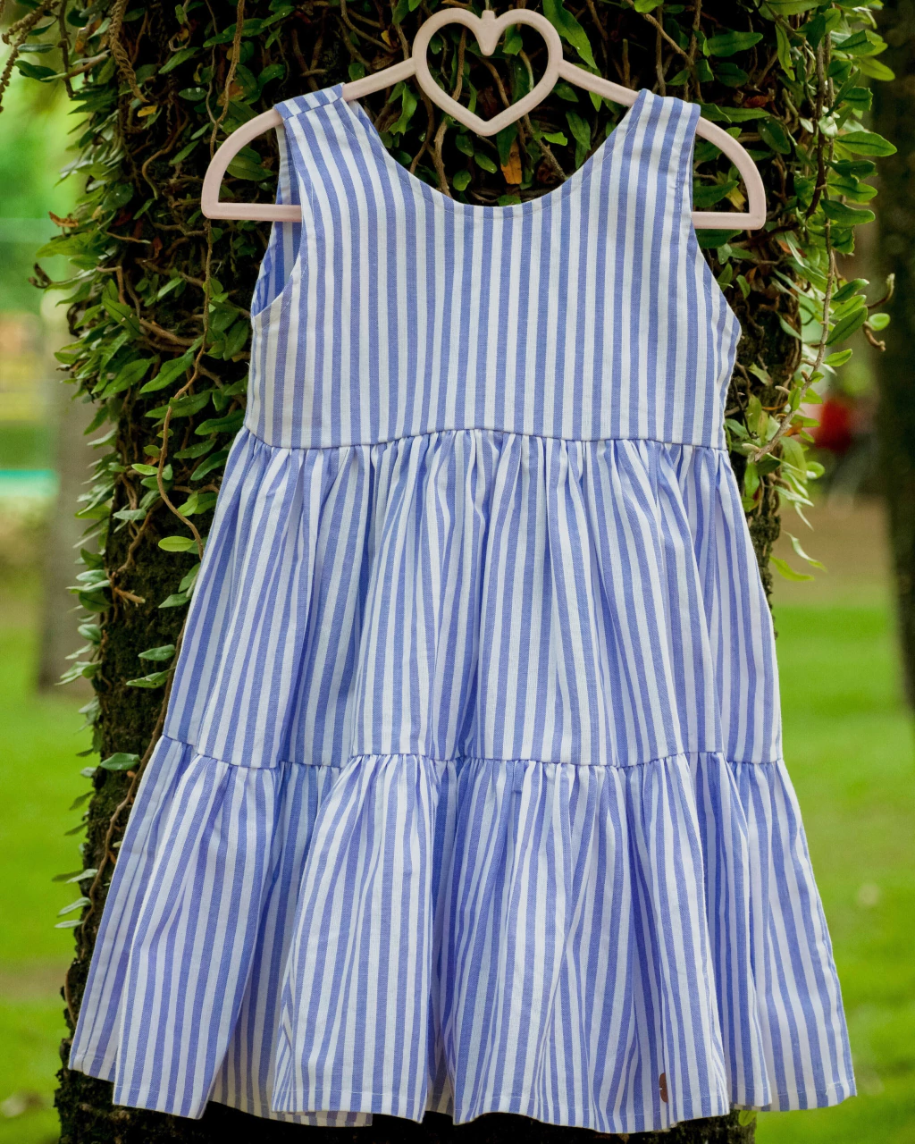 O Vestido Godê Capri é perfeito para meninas que precisam de conforto e estilo no dia a dia. Com estampa listrada, corte godê e modelo sem mangas, garante leveza e liberdade para brincar ou curtir momentos especiais.